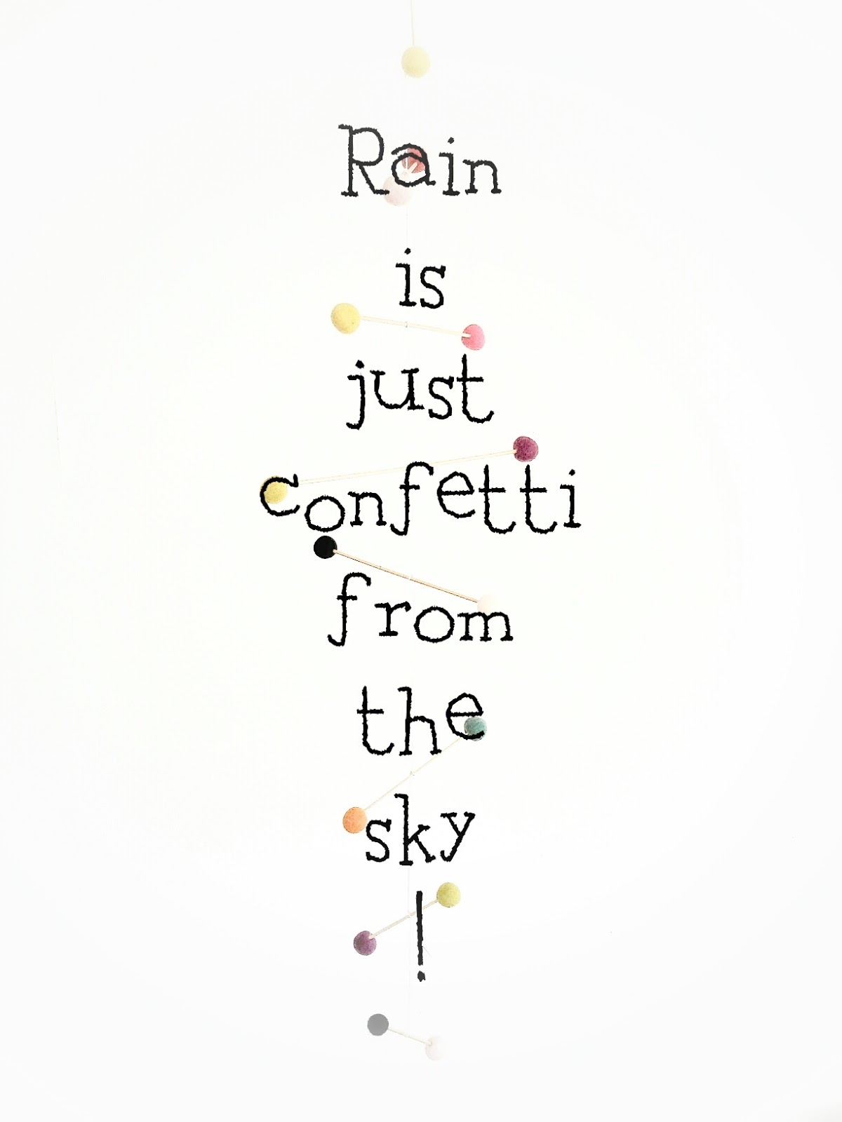 Das Konfetti Mobile bastele ich mir bestimmt auch bald, schöne bunte Aufmunterung, wenn der Frühling nicht will wie er soll und dein Regenspruch ist einfach nur genial: Das Leben besteht aus Konfetti!