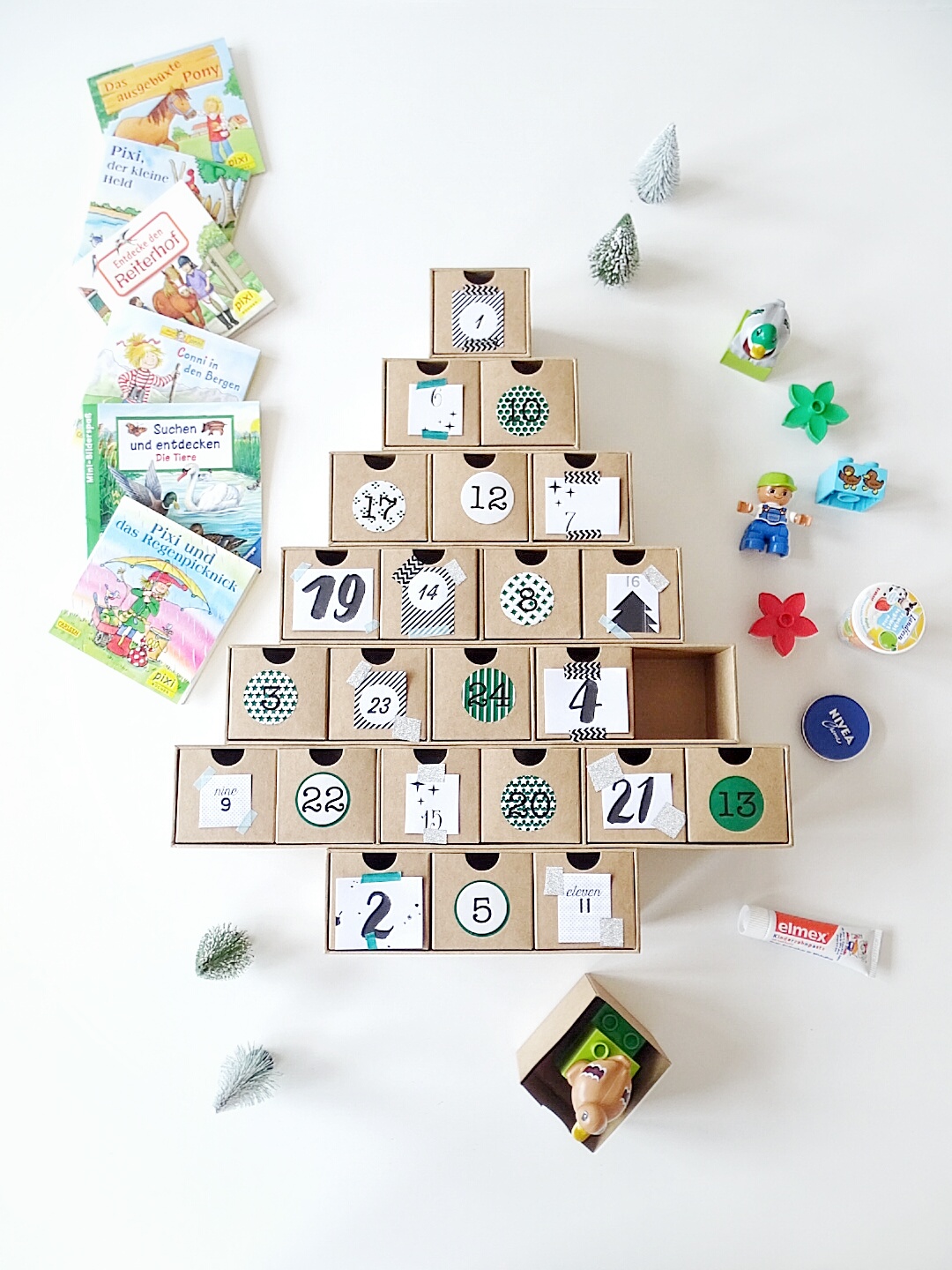 Befüllt haben wir den Kalender mit Gummi-Tieren, kleinen Büchern,